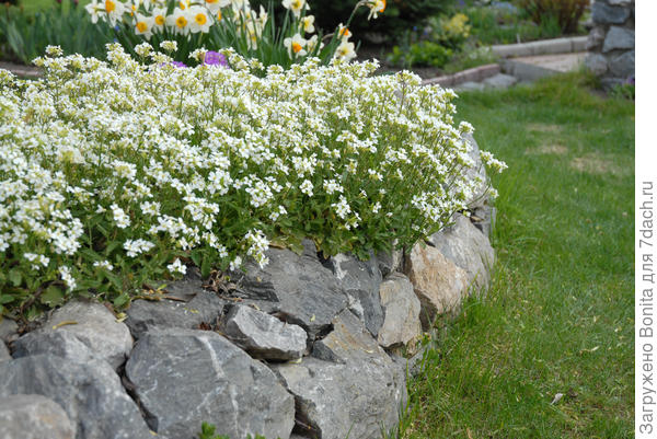 Арабис (другое название резуха) в моем саду не новичок. Он рос на подпорной стенке много лет. Растение неприхотливое, не требует особого ухода, ничем не болеет. Любит солнце, но может расти и в полутени. Единственная забота — не любит застоя воды. Выращен был из семян. Среди камней смотрится, на мой взгляд, замечательно.