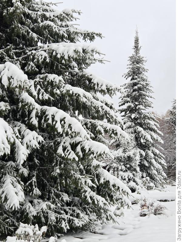 Вчера еще насыпало. Впечатляющее зрелище. Совсем зимние пейзажи — как старые новогодние открытки советских времен.