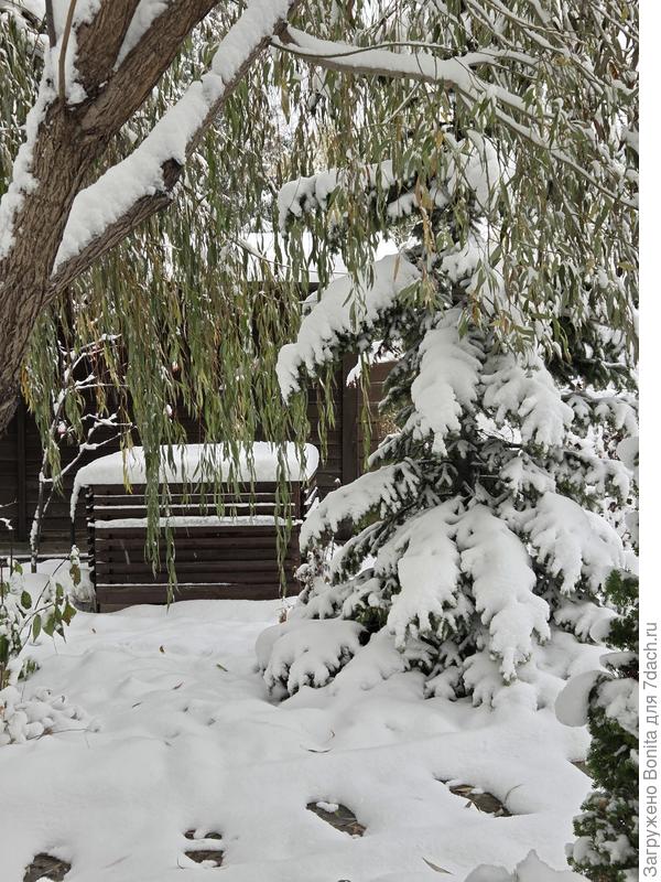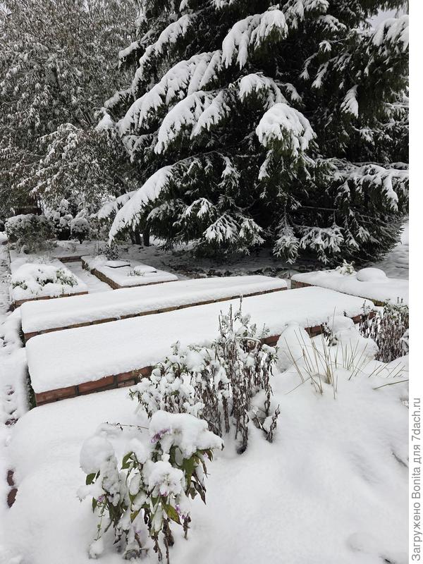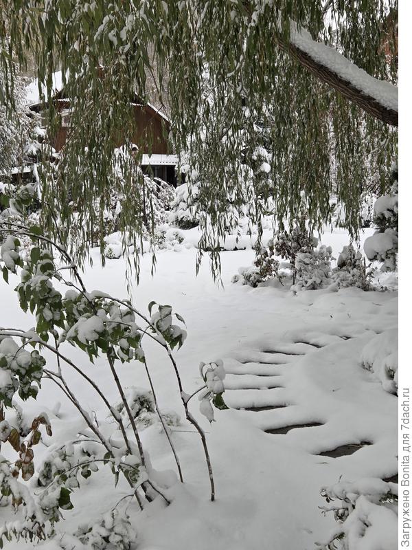 Вспомнила, еще малину не пригнула, не подвязала. Хотя ее снегом уже пригнуло.🙂