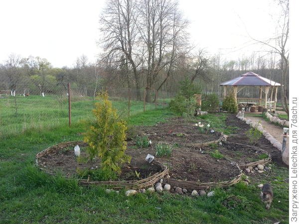 На месте клумбы и беседки была свалка. Камни все выкопаны при попытках вскопать огород. Фонарики из винтовых банок.