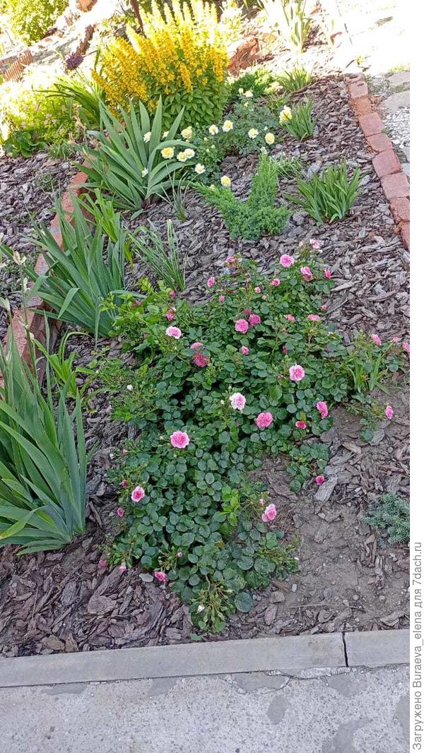 Уже в планах обыграть розовый кустик розовой растюхой «тон в тон» или светлее… Чтобы получился справа нежно желтый пятачок, слева — пастельный розовый. Но пока долгоцветущее в пастельных розовых оттенках многолетнее растение не нашла… Эх…