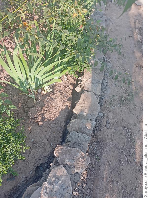 К лету, когда закончился у нас сезон дождей, мы все же решились на строительство подпорной стеночки. Долго думали, из чего бы ее нам сделать. Имеющихся в наличии целых и нерассыпающихся кирпичей было удручающе мало. Валуны у нас в степях не водятся. В магазинах и на рынках «дикий» камень стоил (да и стоит) каких-то невероятных денег. Зато у нас много обломков бетона (когда-то была забетонированная площадка) и еще неопознанного строительного мусора. Решили и постановили — делаем подпорку из того, что есть.