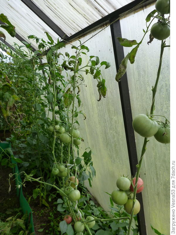 Вот этот томатный куст вырос в теплице самосевом, из забытого на земле по осени упавшего плода. Взошел пучок всходов, лишние я убрала, и — вуаля! — «само растёт». По срокам (лето 2017 г., ужасное...) всходы примерно 15 мая, дата снимка — конец августа. Да, не ранний урожай, но почти без хлопот. И вообще без каких бы то ни было пересадок и пикировок.