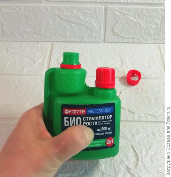 У биостимулятора роста «Bona Forte» интересный флакон. Чтобы набрать нужное количество удобрения, нужно открыть крышку у более длинной горловины и выдавить нужное количество, надавив на флакон. Жидкость попадает в мерную ёмкость наверху флакона и затем её легко вылить в нашу тару, где мы будем разводить удобрение. Препарат разводится в небольшом количестве воды, затем доливается до 1 л.