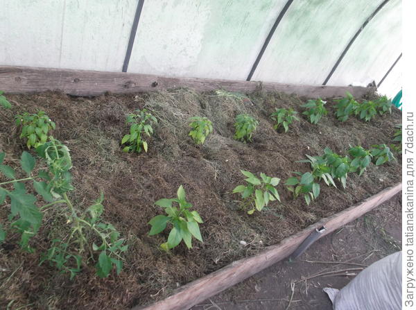 Я долго сомневалась, сколько делать грядок в теплице – 2 или 3. При ширине теплицы в 2,5 метра я всё-таки решила сделать 3 грядки и не пожалела об этом. У меня растения были высажены в шахматном порядке. Хотя, как я поняла позже, смысла в этом нет никакого. Больше всё равно не входит растений. Поэтому в новом сезоне буду сажать по одной линии.