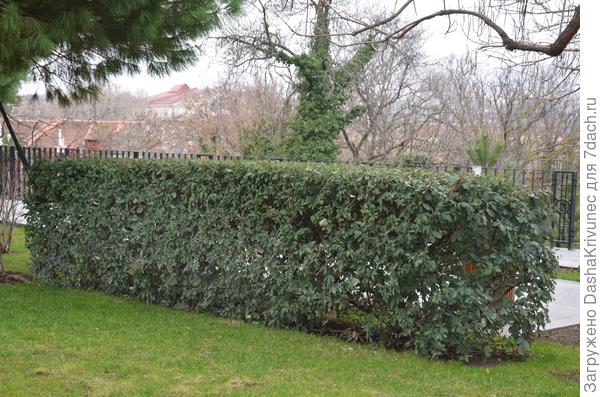 Совершенно верно: по такому фото сложно определить, из какого кустарника сделана живая изгородь, хотя сама живая изгородь снята хорошо. Чтобы определить вид кустарника, из которого устроена живая изгородь, необходимо еще отдельно сделать фото крупным планом побега, листьев, а при наличии цветков, соцветий. плодов сделать и их фото. В данном случае живая изгородь сделана из лавровишни лекарственной (Laurocerasus officinalis L.), семейство Розовые (Rosaceae); еще смотрим на сайте вот эту мою статью: Лавровишни: 2 вида для южных дач
