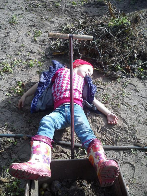 Тачка имеется персональная и грабли веерные. Траву собирает, отвозит в свою грядку. Сам, главное, себе грядку определил ))) велел там горошек сажать, очень его любит.