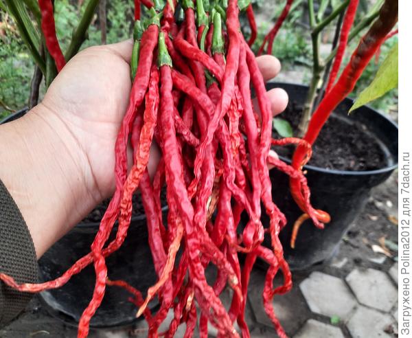 Урожай этого перца мы в основном сушили в целом виде и мариновали кусочками. Сушеный я добавляю в овощные блюда и супы.