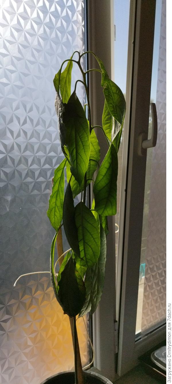 Авокадо — дерево. Его корню нужно место, нужна глубина. Пока это маленький сеянец, ему хватает горшка, он выглядит красиво, ему хватает сил. А как подрастает — ему становится тесно, плохо. Опущение листьев — по сути это слабость черешков. У них просто нет сил держать крупную и тяжёлую листовую пластинку.