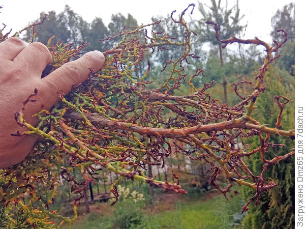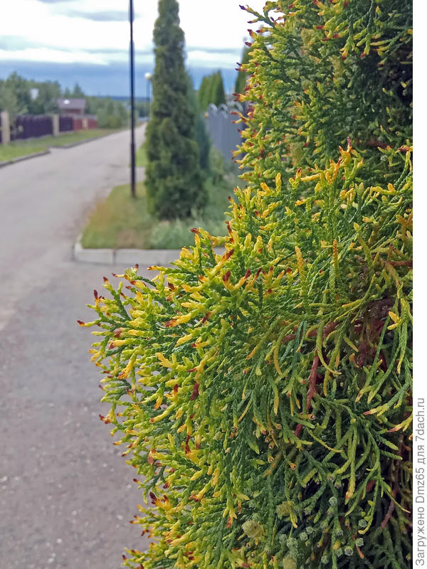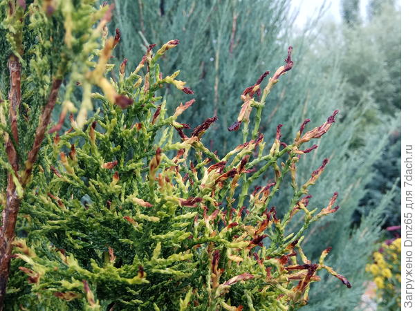 . и еще посм пож-та — кончики у можжевельника стали как то «закручиваться», как будто «секутся», а на туях (на всех уже) кончики черные стали, «как обгоревшие»… и это распространяется очень быстро…