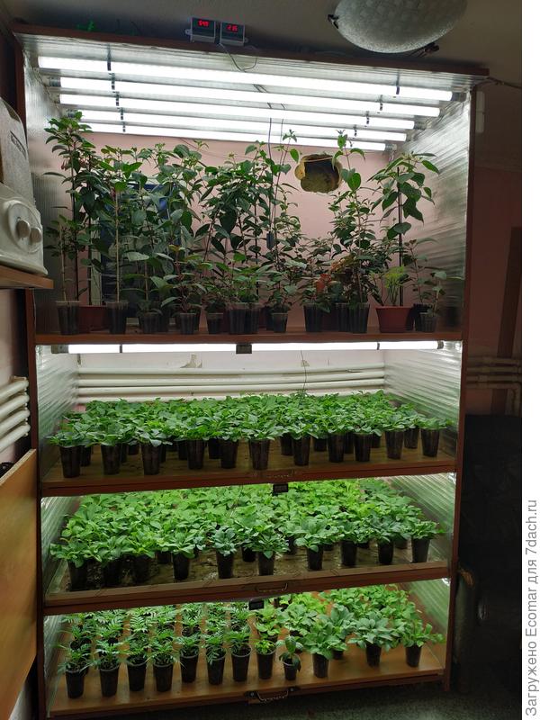У меня, 2 стеллажа по 5 полок, на каждой полке лампа 40 ватт, рассада растёт с большой скоростью. В хозблоке, 2 минипарника с лампами разной мощности, ещё подоконники, оранжерея и теплицы в придачу