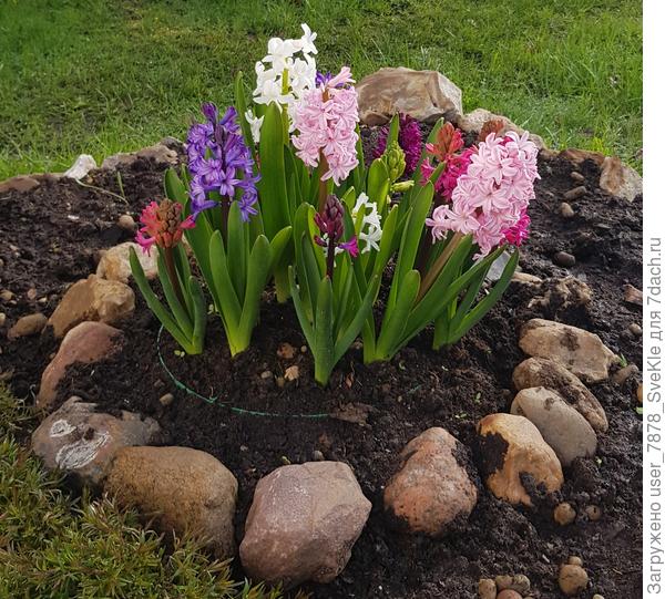 А вот как в цветнике, в центре гиацинты, по краям нарциссы, я их не выкапываю, и тюльпаны. Всё что выкапываю помечаю по углам зелёными палочками.