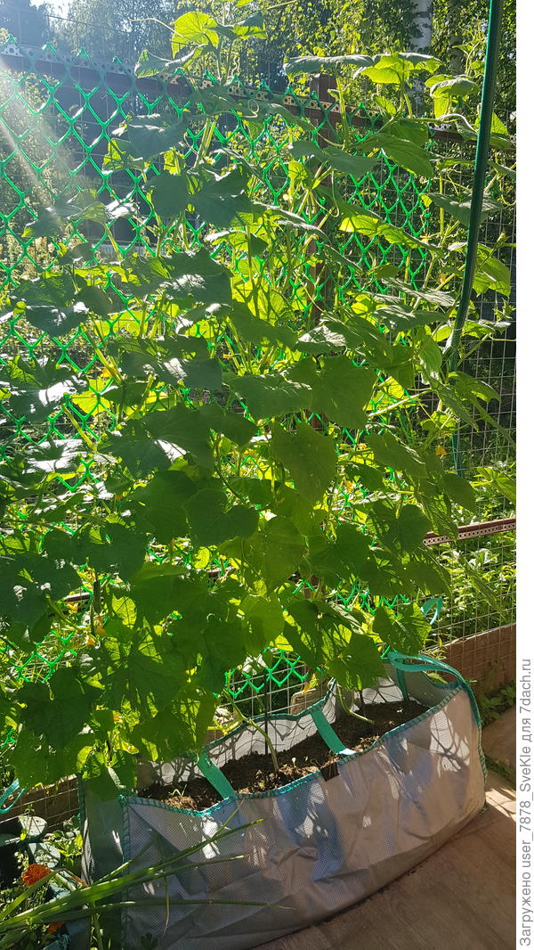 После высаживания огурцы полезно хорошенько пролить «Фитоспорином К». Это убережёт их от грибных заболеваний. Мешки с растениями нужно разместить таким образом, чтобы была возможность устроить шпалеру для подвязки отрастающих плетей. А ещё есть одна хитрость: когда урожай с нижних завязей будет собран, и стебель начнёт оголяться, его можно опускать в мешок, сворачивая и присыпая землёй. На нём будут отрастать новые корешки, и всё растение будет омолаживаться — снабжать вас урожаем до самых холодов.