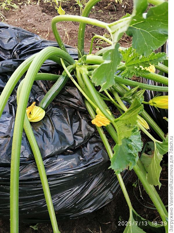 Единственный «бесполивный» вариант, который у меня вообще сработал, — это выращивание тыквенных на черной пленке. Именно пленке, не агроволокне. Причем стелю пленку в два слоя, не разрезая рукав. Но это метод для целины или обычных грядок — на поднятых, боюсь, под пленкой корни спекутся