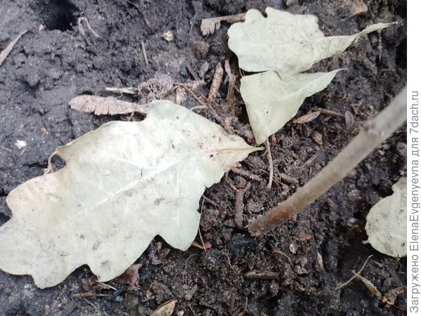 Дубок так пролежал полдня на жаре, придавленный ограждением, ночью был ливень. Когда в 5 утра я его обнаружила, листья были поникшие, но не сухие. Остаток корня примерно 20 см. Высота стволика примерно 25 см.