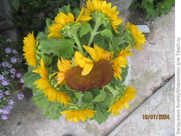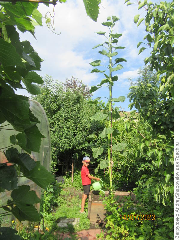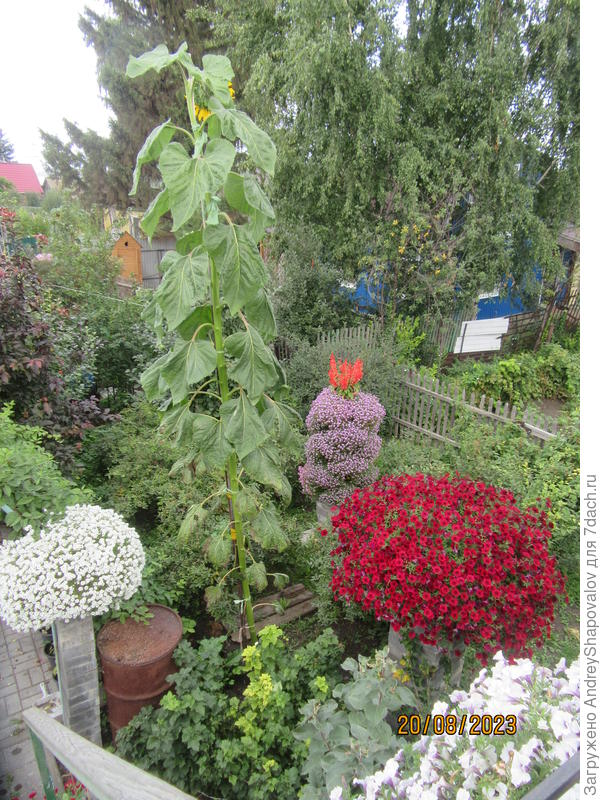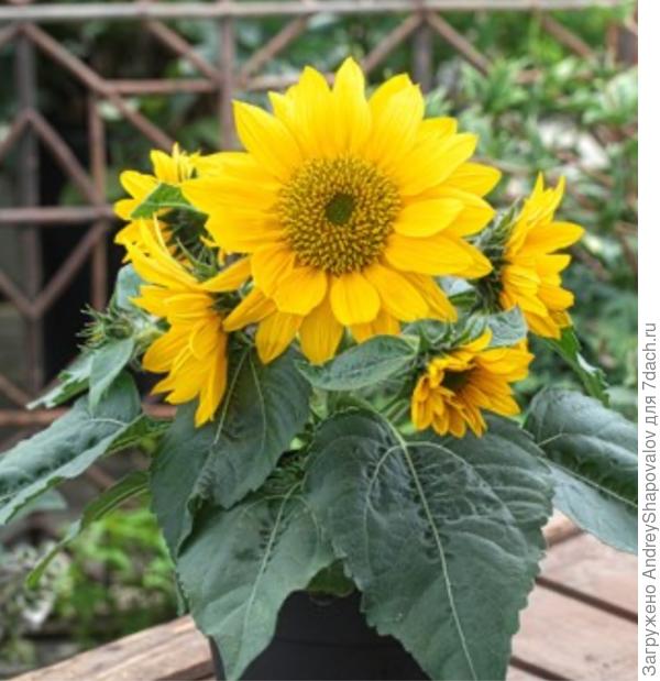 А этот подсолнух — заявлено 2 метра, каким вымахает — не знаю… Попробую прищипнуть часть. Соседка по дому любит подсолнухи — ей буду срезать, если сумею «подпрыгнуть»...