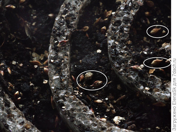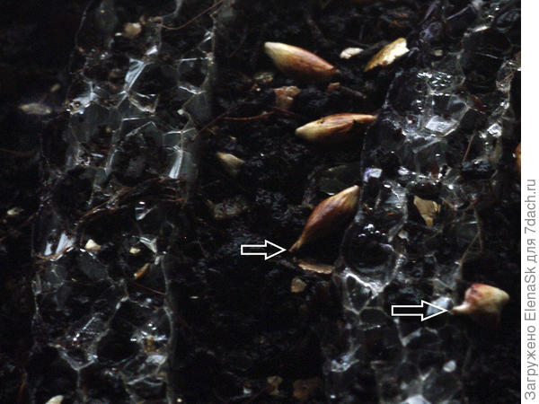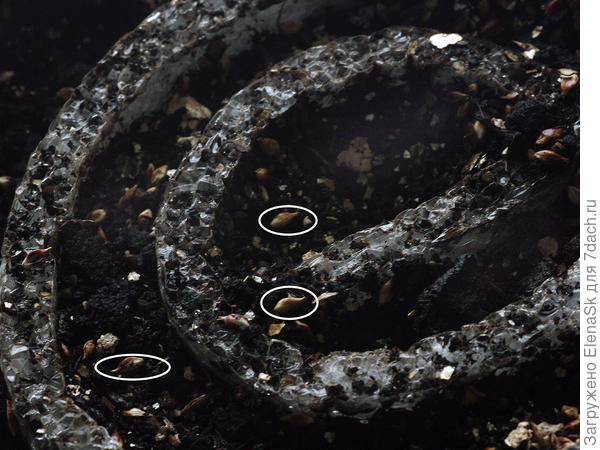 Нетерпеливая я… Сегодня смотрела, как у меня там в улитках бронзовая осока. Ну посмотреть-то могла только семена, которые на поверхности _не знаю, видно ли будет на фотографиях — кое где я пометила стрелочками, овалами. Парочка — уже погрузили хвостик в грунт — жду всходы через парочку дней…