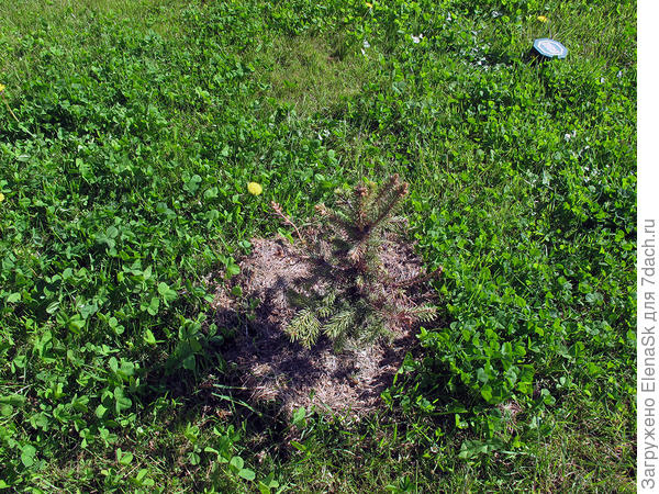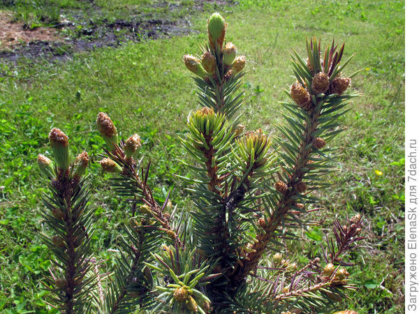 На фото ниже слева видна сухая ветка, с которой осыпались иглы и тут же появились коричневые шишечки — это тоже свежие приросты будут через несколько дней. Конечно, в этот раз ель спаслась сама, но я поняла, что до осени должна буду поднять ей грунт и как-то его огородить, чтобы тот не расползался в стороны. Второго половодья ель может не пережить.