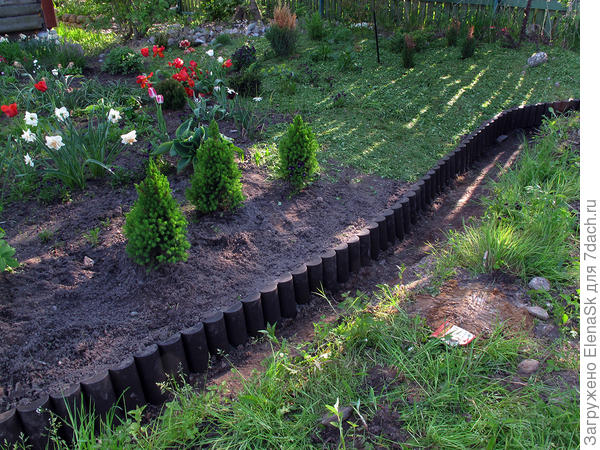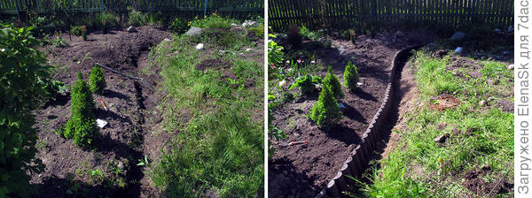 В качестве отдыха после первого кольца углубила канавку (сухой ручей), по которой вода уходит за пределы участка, ну и пока сухо… Тут выдумывать линию было не надо, она была, поэтому сразу поставила ограждение.