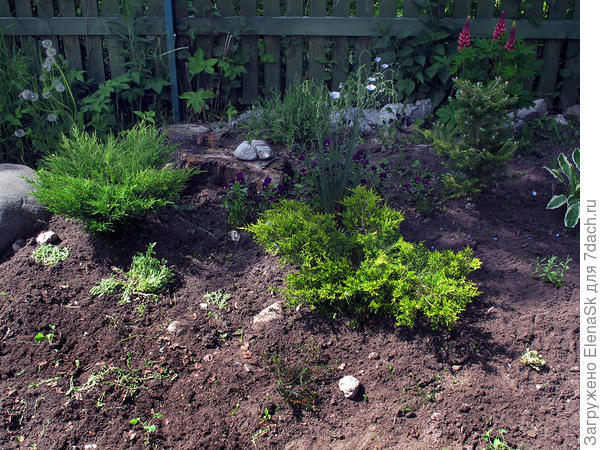 Это горка с зеленым камнем, пихта, два стелющихся можжевельника...