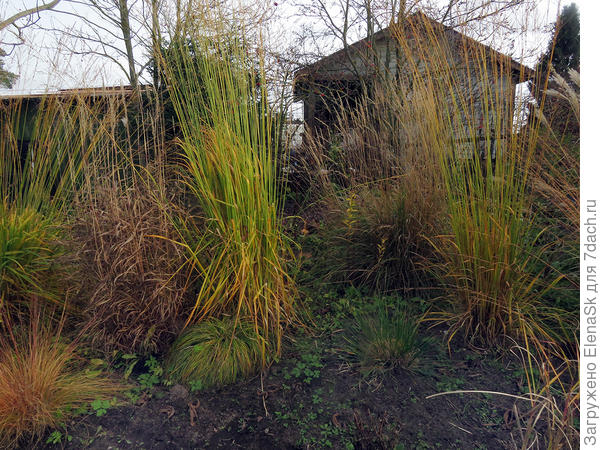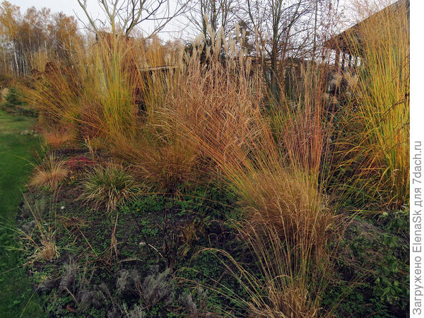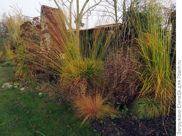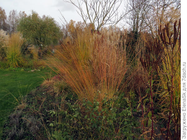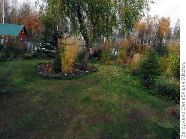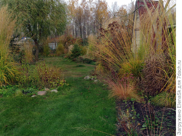 На первом фото видна слева тростниковая молиния «лаймового» цвета. Вообще молинии в нашем регионе обычно не окрашиваются, может, для них просто климат не тот. Во всяком случае, первые у меня появились в 2014-2015 году, и такого осеннего окраса у них я еще не видела. Обычно по осени их листва просто жухнет, а длинные цветоносы с метелками просто обесцвечиваются.