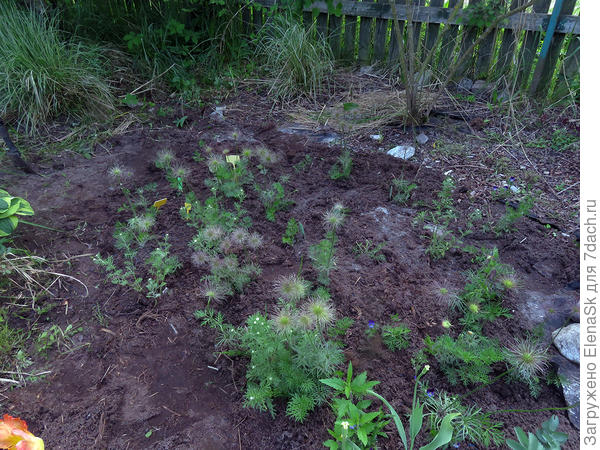 Так как рассада была «о двух листочках», зная, как у меня буйствуют сорняки — ставила помимо маяков еще и палочки так, чтобы этих малюток при прополке найти. Сначала нахожу палочку, знаю, что где-то ниже маячок, потом между ними эти два листочка прострела. Сначала аккуратно выщипываю все непосредственно рядом, а потом уже все вокруг. Вы знаете — помогло! Правда, найти эти палочки тоже было нелегко. Думаю, что надо будет прутьев более высоких нарезать и белой краской их покрасить...