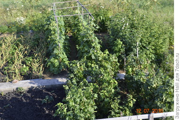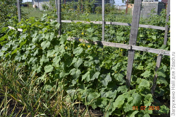 Эти огурцы выросли, и установил шпалеру, как на верхнем фото. На фото видны бороздки, по которым поливаю.