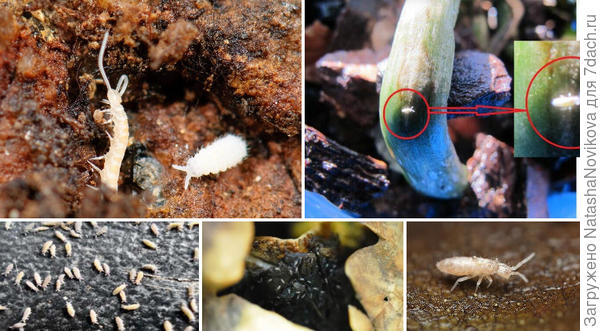 Только сейчас смогла рассмотреть мошек в горшке с цветком. На тех, что вы показали, не похожи, они очень маленькие, 1 мм где-то, через лупу тоже плохо видно, но они ближе к серому цвету, на мушек похожи, но чётко не видно, мощности лупы маловато. И вылезают они на верх земли, когда поливаешь растение, боятся света, как я понимаю, не прыгают, просто ползают по земле. Мне кажется, что именно из-за них мои растения гибнут, возможно они были в покупном грунте, и наверно все же вылезают из горшка, чтобы пробраться в другие.