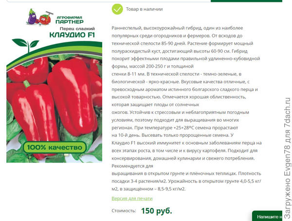 На рассаду высевала 28 февраля. Всходы 5 марта. Высадила в теплицу 12 мая. Куст вырос где-то с метр. Вступает в плодоношение не рано. Первые перцы завязались дружно. Крупные, толстостенные, вкусные.