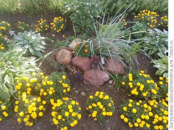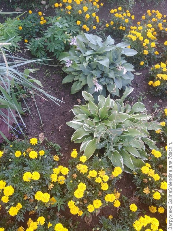 По краям, вернее, по всему периметру цветника, растут желтые бархатцы желтого. Небольшие цветочки не только высвечивают тенистый уголок, но и лечат землю.