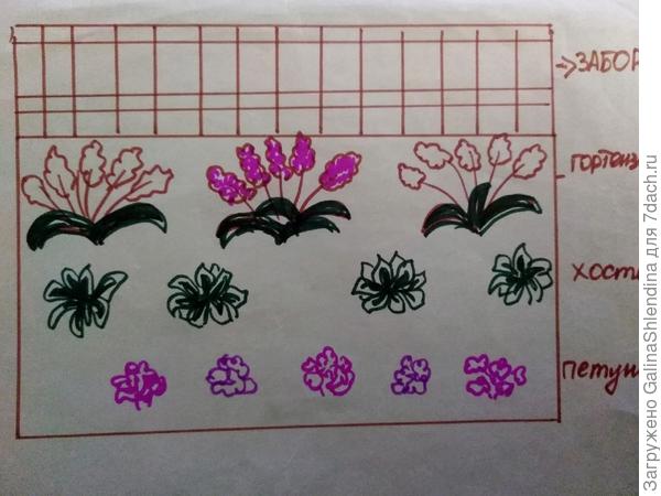 Планирую сделать цветник, который будет располагаться вдоль забора и состоять из гортензий, хосты и петуний.