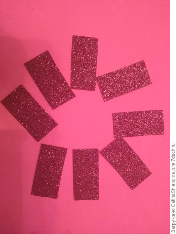 Для изготовления снежинок я взяла фоамиран красного цвета. На обратной стороне начертила прямоугольники размером 3х6 см и квадратики 2,5х2,5 см. Для изготовления одной снежинки нужно 7 квадратиков и 7 прямоугольников.