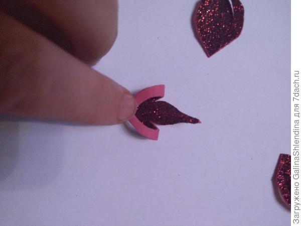 Наношу немного клея на кончик внутреннего листочка. С помощью пинцета склеиваю уголок. Так делаю со всеми 7 деталями.