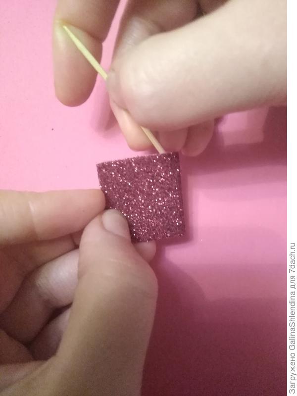 Беру листик 6х3 см. Складываю пополам. С помощью зубочистки отмечаю середину. Переворачиваю деталь блестящей стороной вовнутрь.