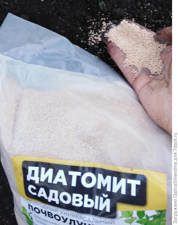 В грунт добавила немного диатомита, который очень хорошо улучшает почву. После посадки диатомит дополнительно рассыпала вокруг кустов. Он прекрасно отпугивает муравьев и различных насекомых.