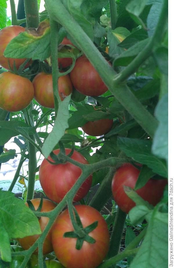 Томатики выросли небольшими. На каждой кисти томата было по 10-12 плодов. Плоды были округлые, красные в желтую полосочку. Очень оригинальный окрас! Я их называла «арбузики».