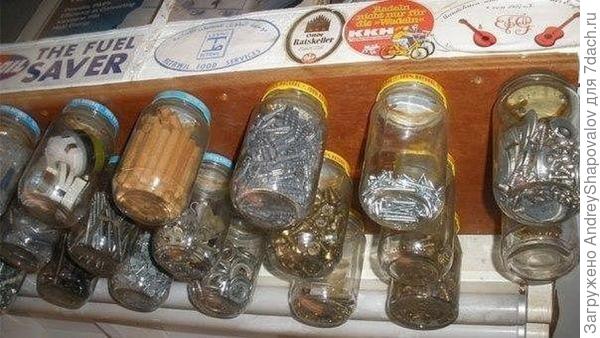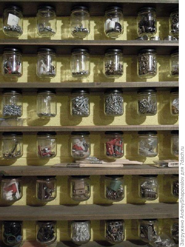 Как видно на картинке выше, мелкие канистры, прикреплённые к стене саморезами — хорошие полочки для мелочи. Так в одной лежат шпингалеты, в другой навески. На фото не видно, но в реальности всё на глазах.