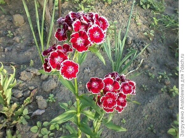 Ну и конечно же, как обойтись без украшения участка — без цветов? Купила рассаду гвоздичек, посадила шесть кустиков, выросли гвоздички все разные, но красивые.
