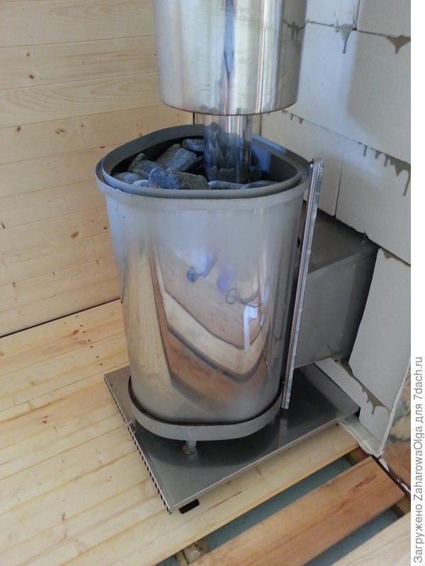 Парная максимум рассчитана на 2-3 человек. Из-за того, что она небольшая по размерам, при топке парной температура поднимается очень быстро, разница между температурой в парилке и в моечной приблизительно на 20-30 градусов.