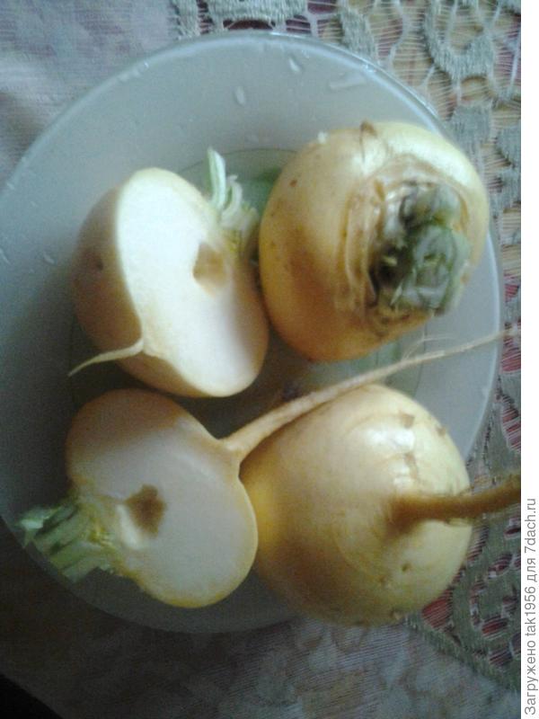 Я сажала раньше Миланскую розовую репу. Вот это класс! Нежная белая мякоть. К сожалению, в этом году не нашла семян. Сажаю всегда Петровскую, в этом году и весной сажала, и в августе. Вот фото августовской. Как всегда, нежная и сочная.