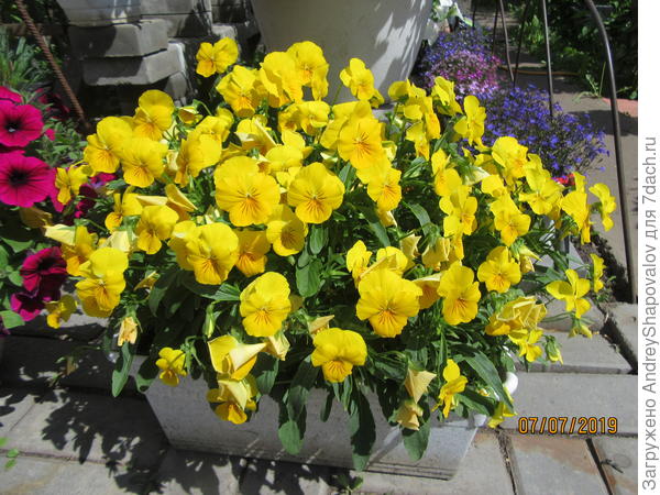 вот посмотрите на мою виолу в кашпо… По-моему, прелесть! Покупала обычные, не ампельные… Это фото сделано в августе.Высаживала через рассаду! Но, мне показалось семена в пакете были перепутаны… в двух других горшках цветки получились розовые и мелкие.