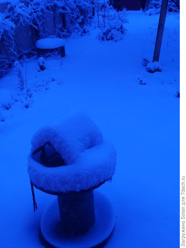 Слева на фото колодец — сейчас его не видно, теперь перед ним беседка. Так как места было мало, долго думали, куда ее разместить, в итоге сделали ее сквозной, через нее теперь ведет дорожка. Как потеплеет, постараюсь сделать фото с беседкой.