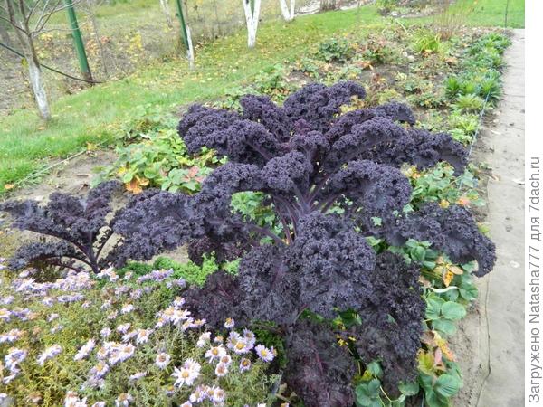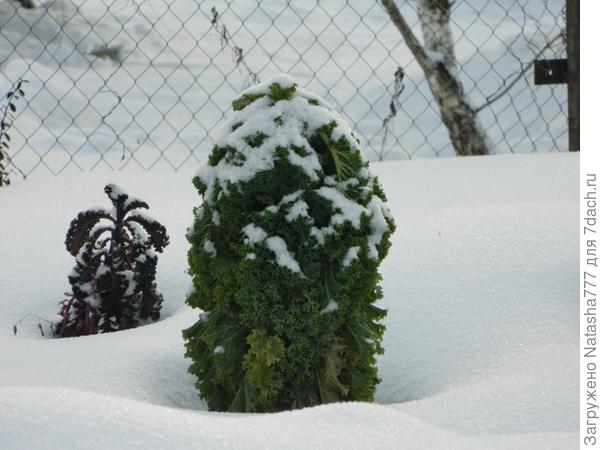 Отлично зарекомендовал себя в наших краях среднеспелый гибрид кудрявой капусты 'Red Russian F1' ('Красная Русская F1'). Листовая розетка достигает высоты 50-60 см и выделяется волнистыми серо-зелёными листовыми пластинами с красивой резной каймой, сиреневыми прожилками и черешками. Сорт холодостойкий, урожайный, с нежными сладковатыми листьями.