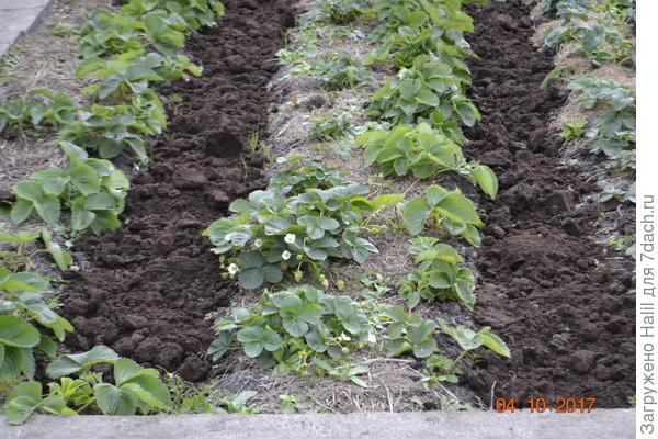 Вот так выращиваю клубнику, в бороздки кладу навоз или навоз-перегной и поливаю по бороздкам.