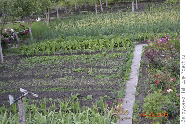 Вот здесь растет морковь и свекла, поливаю по бороздкам (по канавкам)