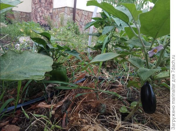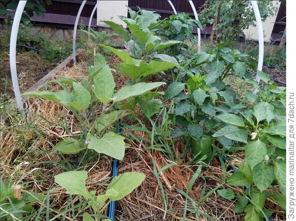 Баклажаны, которые оказались притенены, сильно отстают в росте. Сажала на пробу — подруга дала свою рассаду. Перец вырастила из семян в пеленках. Поняла силу хорошего семени. Задохлики, те, что пережили все опыты — на заднем плане вторая грядка, а за ними уже цветник со смородиной. Не изумляют размерами и мощью, как ваши. Укрывным только их спасала и перцы-баклажаны. Потом стало очень жарко. даже кисти цветочные на помидорах сгорели кое-где. А в прошлом году был июнь холодный и мокрый. Поэтому дуги везде поставили на всякий случай. Но не потребовались. Потребовалось капельное. Его поставили 21 июня. Все не могли решиться без расчетов и чертежей. Но подруга подарила и даже смонтировала. на основные грядки и без всяких там редукторов.