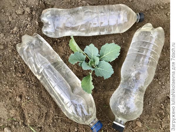 Бутылки тяжелые. Ветер их не унесёт, кошачья лапа не сдвинет, собаке сверху на них спать неудобно, муж случайно не наступит. Отличная временная защита для молодого растения!