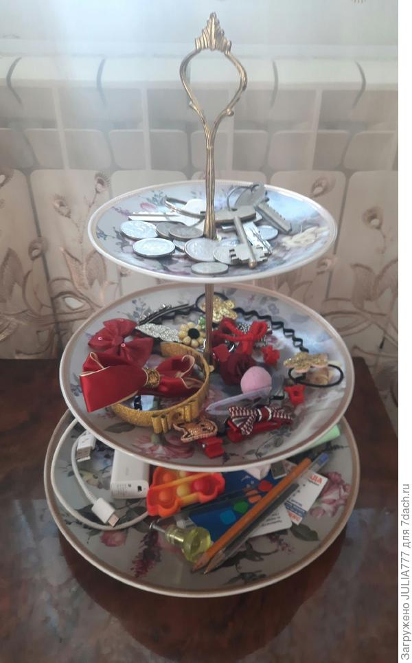 Была один раз в Новый Год поставлена на стол. Потом пылилась на шкафу без дела, мешала. Постепенно стала заполняться всякой несъедобной мелочью, типа оторванной пуговицы, подобранной заколки, карандаша. Это показалось удобным. В коридоре коробочку пластиковую убрала, куда все кидали на ходу: монеты, резинки для волос, таблетку, оторванный брелок… И потом всё вперемешку лежало. Было сложно найти нужное, так как не видно, что там внизу. Выставила фруктовницу ближе к выходу, и мелочёвка теперь рассортирована и на виду.
