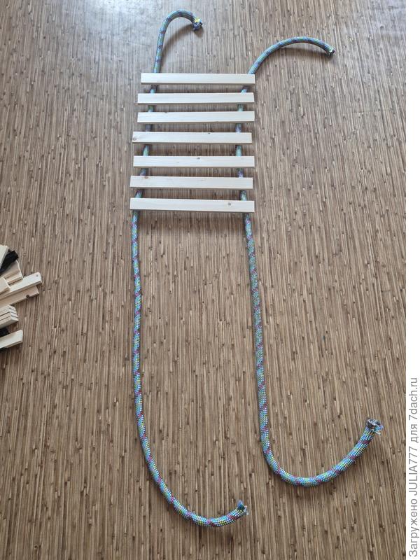 Дальше просто соединить наши брусочки-«шпалы» с двумя параллельными «рельсами» шнура, приматывая крест-накрест шпагатом.