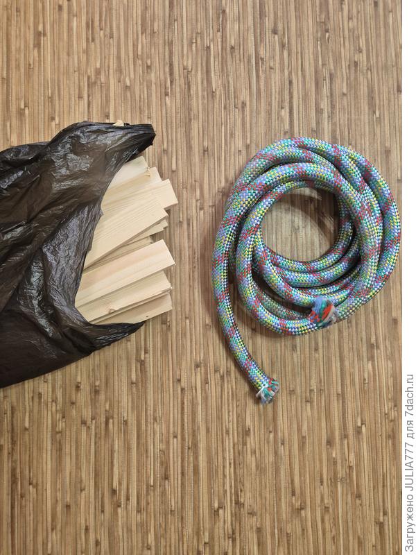 Шнур разрезать пополам. На два отрезка по 2 метра. Рейки распилить на одинаковые дощечки по 40 см.